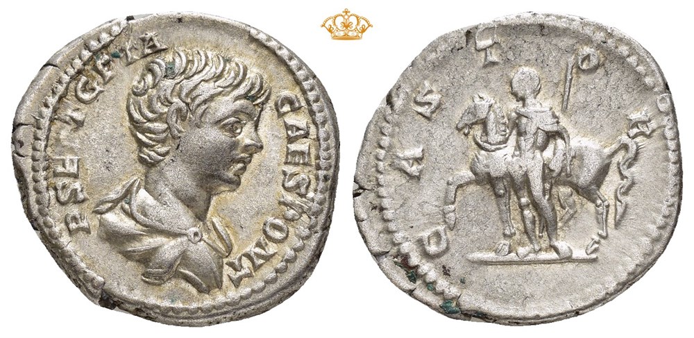 Geta 198-209 AD. AR Denarius struck circa 200-202 AD, Rome Mint, 3,38 grams, 18,5mm. Beautiful portrait. Obverse: P SEPT GETA CAES PONT, bust of Geta, draped, facing right. Reverse: CASTOR, Castor standing in front of horse, which he hold with rein in right hand, and holding spear with left arm, both facing left.