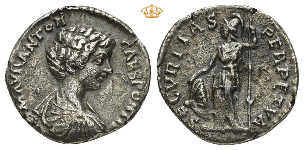 Caracalla 198-217 AD. AR Denarius struck circa 196-197 AD, Rome Mint, 2,57 grams, 18mm. Obverse: M AVR ANTON CAES PONTIF, bust of Caracalla, draped, facing right. Reverse: SECVRITAS PERPETVA, Minerva standing, facing left, resting right hand on shield set on ground, holding spear in left hand.