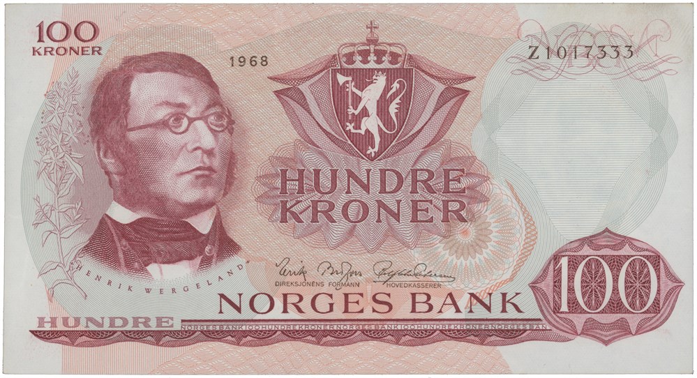 100 kroner 1968. Z1017333. Erstatningsseddel/replacement note (1-million).