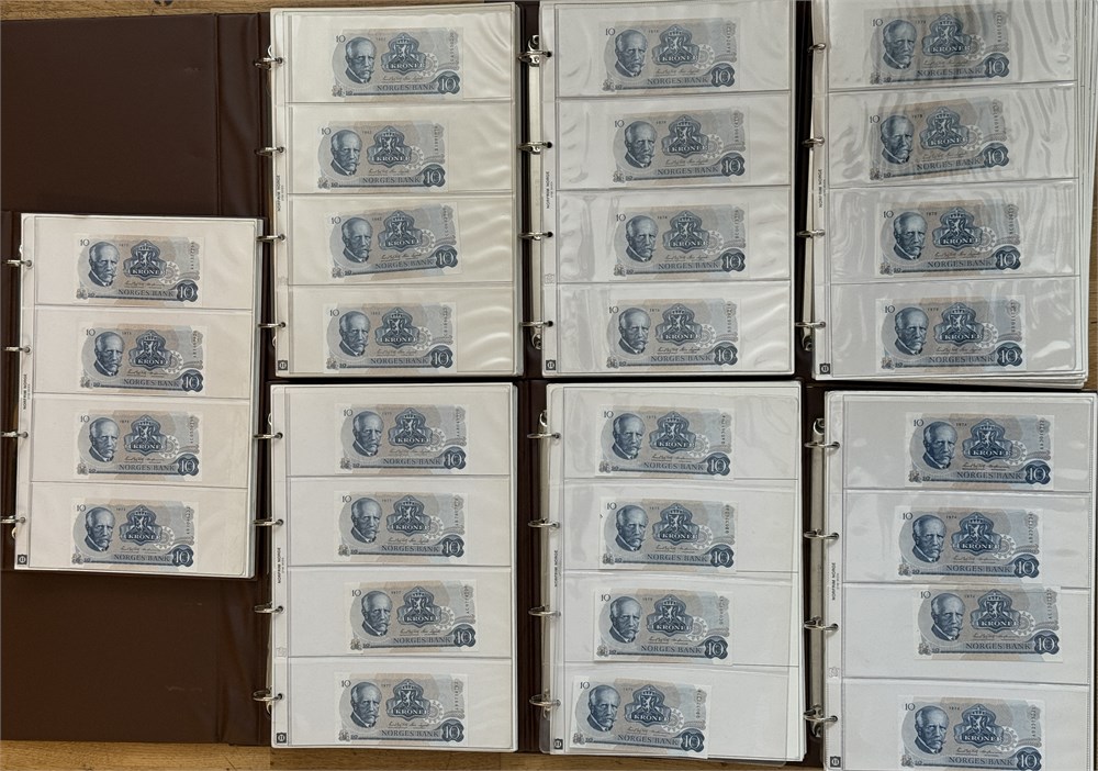 10 kroner 5. utgave, komplett fra 1973-1984 med erstatningssedler