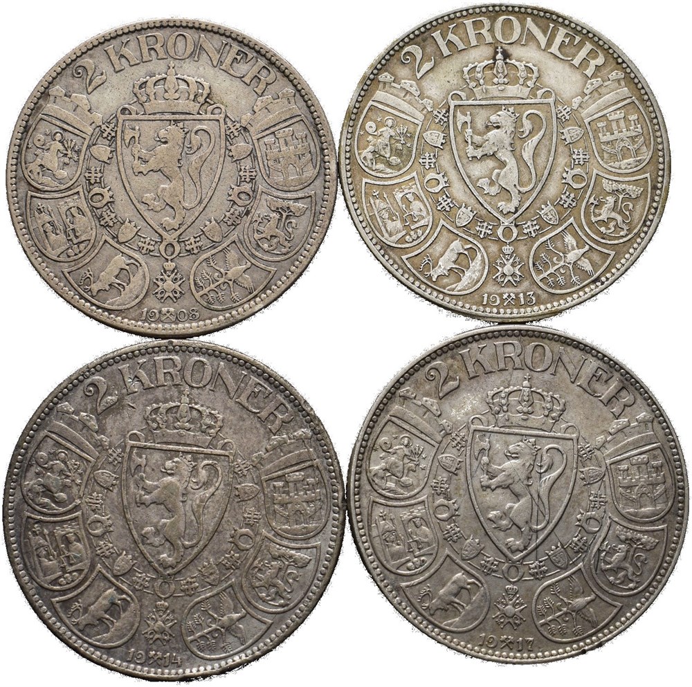 2 kroner 1908, 13, 14 og 17, alle med anmerkninger