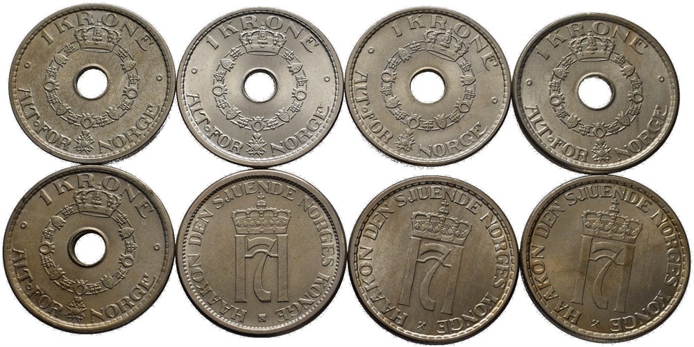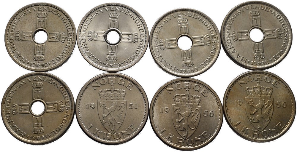 1 krone 1940, 49, 50 (x2), 51 m/hull, 51 u/hull og 56 (x2), totalt 8 mynter., fra 0 til 01