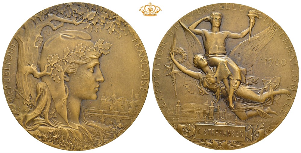 Exposition Universelle 1900, Bronze, Chaplain. Assigned C. Stephansen, 100 g. Original case of issue, but damaged.