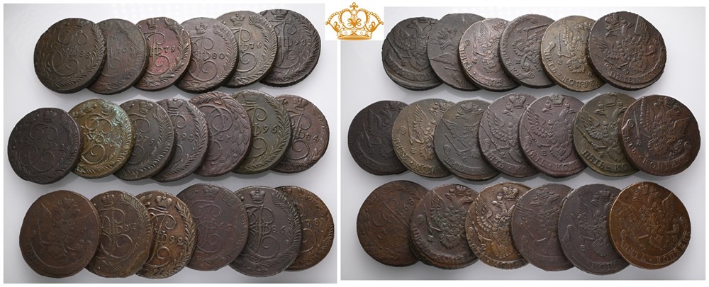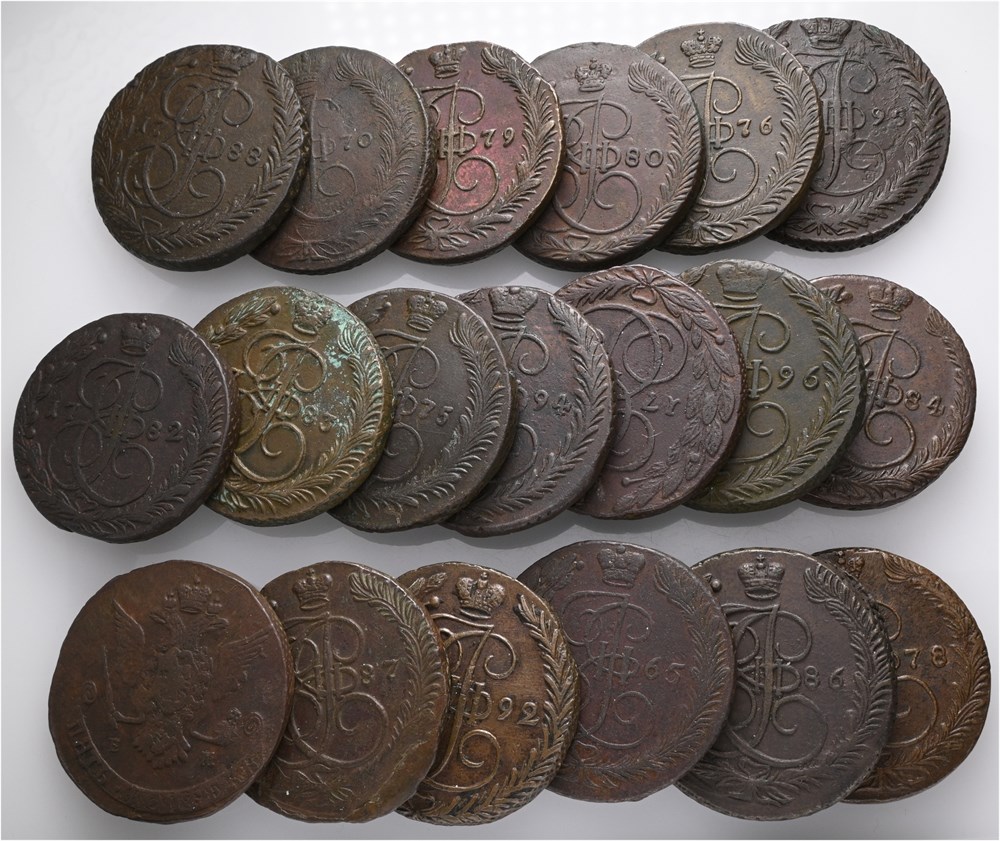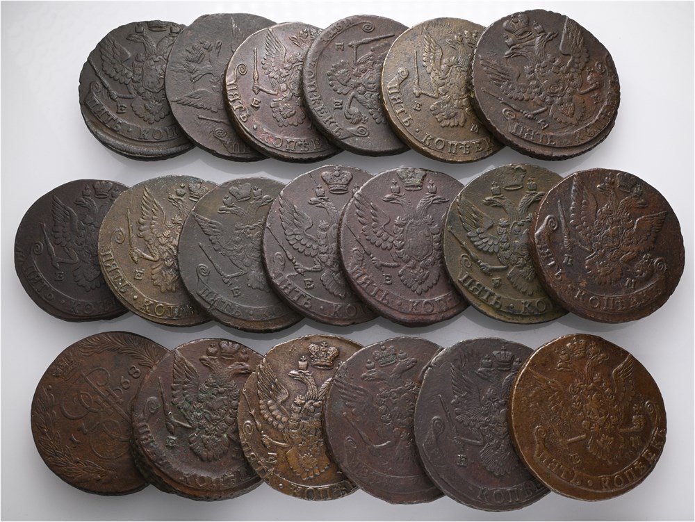 Collection of 5 kopek EM; 1765, 1768, 1770, 1775, 1776, 1778, 1779, 1780, 1782, 1783, 1784, 1786, 1787, 1788, 1790, 1792, 1794, 1795 & 1796. Majority in quality VF-EF to AU. Acquired in the late 1990s to 2010. Nineteen coins.