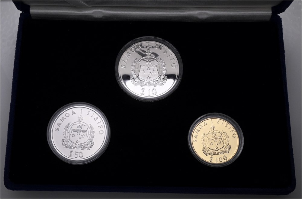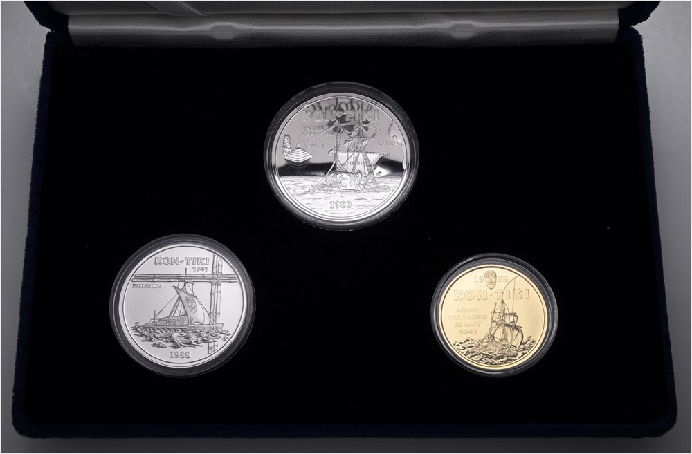 THE KON-TIKI PROOF SET 1988; 100 tala 1988, 7,5 g .900 gold. 50 tala 1988 31,1 g .999 palladium. 10 tala 1988, 31,1 g .999 silver. Includes original case of issue and certificate no. 2961.
