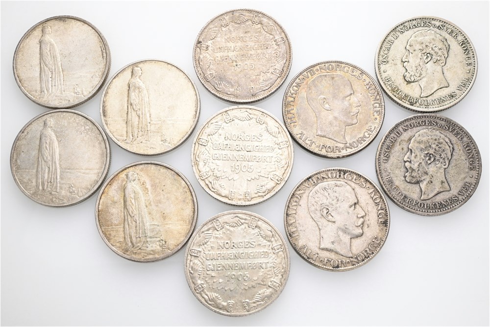 Lot. 2 kroner 1892, 1902, 1906 "Unionsoppløsningen" (2 stk.), 1907 "Unionsoppløsningen", 1908, 1914 "Mor Norge" (4 stk.) & 1916. Kvalitet fra 1 til 01.