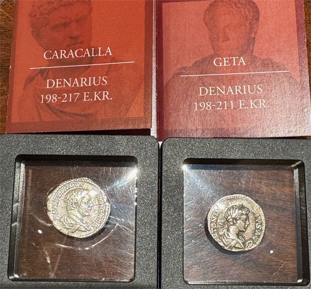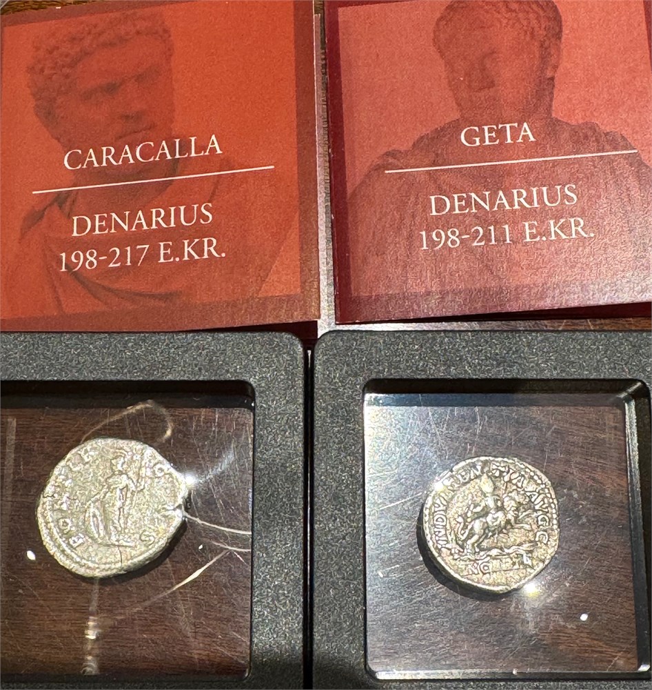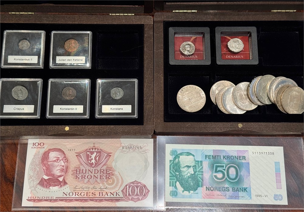 Samling med 10 stk. 10 kr 1964 "Eidsvoll". 50 kroner 1995 (kvalitet 0/01). 100 kroner 1977 K (kvalitet 0/01). Sparebankene i Norge 1822-1972, sølv. To sett med antikke mynter, fem stk. i bronse, samt denarius av Geta og Caracalla.