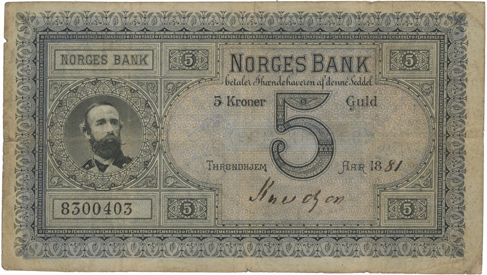 5 kroner 1881. 8300403. Signert Knudtzon.
