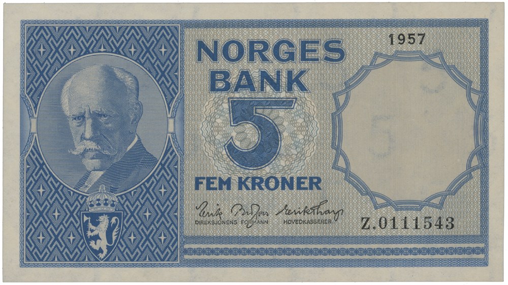 5 kroner 1957. Z.0111543. Erstatningsseddel/replacement note.