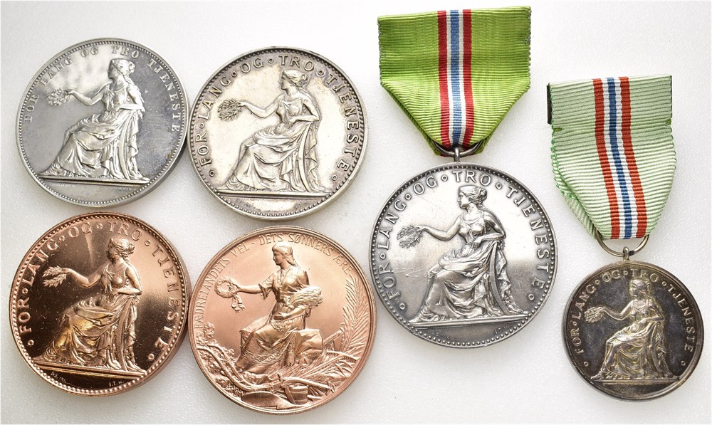 Fra Det kongelige Selskab for Norges vel. For lang og tro tjeneste. Sølv 43 mm (3), sølv 31 mm og bronse 43 mm (2)