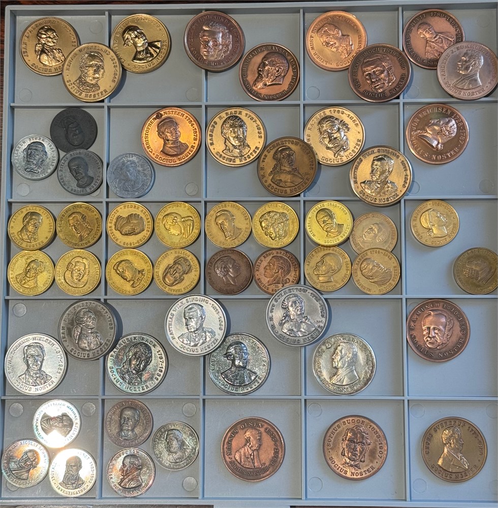 Lott 54 medaljer i sølv, bronse, tambak, zink og bly