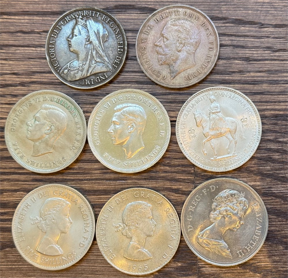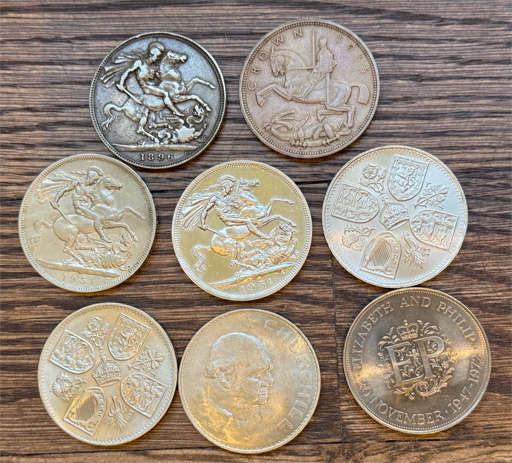 Crown 1896 og 1935, 25 pence 1965 og 1972, 5 shillings 1951 (2), 1953 og 1960