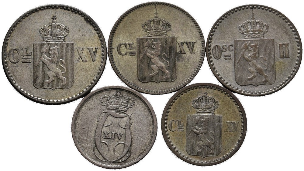 Skillingslott 2 sk 1842, 71, 3 sk 1869, 73 og 4 sk 1871 i varierende kvalitet, fra 1 til 1+