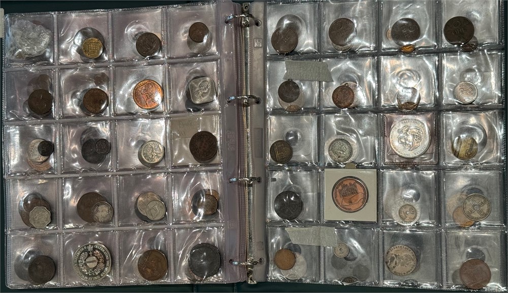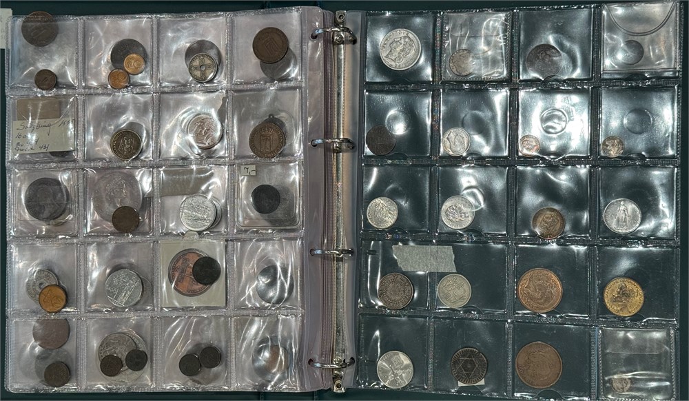 Myntalbum med norske polletter og utenlandske mynter. 14 sider, noe sølv.
