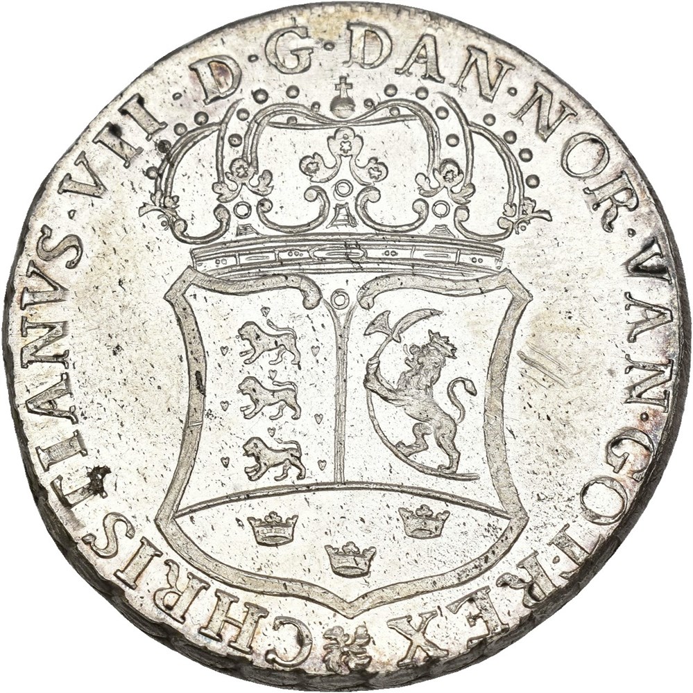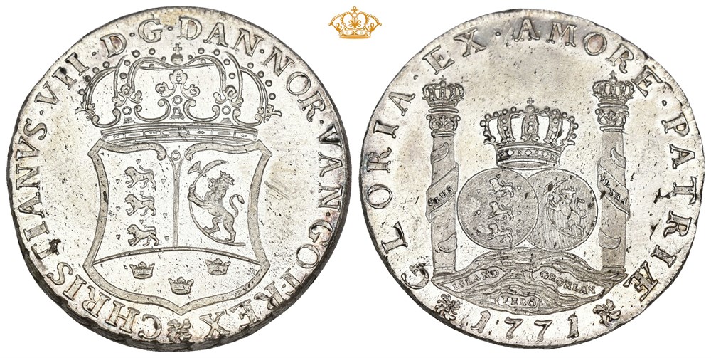 Piaster 1771 (preget i 1774), København. 27,00 g. Et utsøkt prakteksemplar av denne meget sjeldne ettårs-typen, som regnes som en av dansk numismatikk sine mest ikoniske rariteter, med stor internasjonal etterspørsel – der den er kjent som «The Greenland Pillar Dollar».