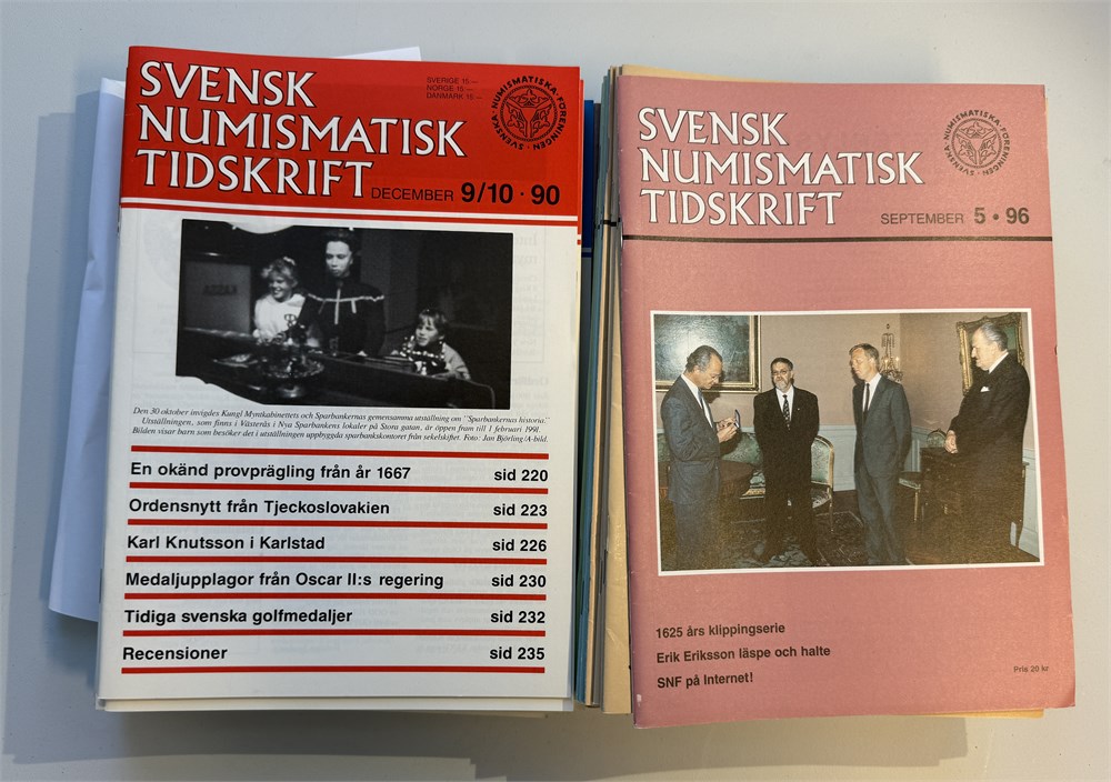 Svensk numismatisk tidsskrift nr 1/1972, nr 3/1982, 3/1983, 8/1983, 3/1984, 3/1986, 8/1986, 9/10 1986, 2/1987, 3/1987, 3/1988, 8/1988, 3/1989, 8/1989, 6/1990/, 7/1990, 8/1990, 9/10 1990, 1/1991,2, 3, 4/5, 6, 7, 8, 9/10, 1/1992, 2, 3, 4/5, 6, 7, 8, 9/10, 1/1993, 3, 5, 6, 8, 4/94, 5, 6, 7, 8, 2/1995, 3, 4, 6, 5/1996.