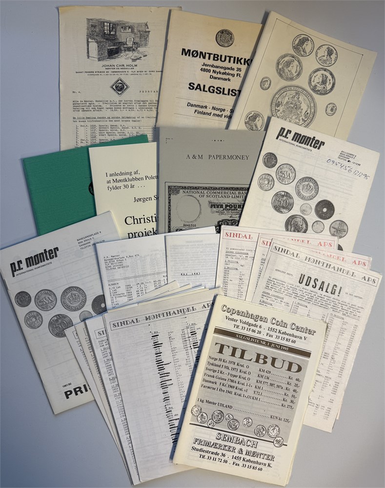 Salgslister fra Johan Chr. Holm nr 4/1954, Møntbutikken Nykøbing 1978, Møntstuen nr 9/1978, Møntboden Aalborg nr 2/1978, Møntklubben Poletten fyller 50 år – Jørgen Sømod- Christian X’ projekterende mønter, A&M papermoney København, PR mønter Århus liste nr 7,8,13, G. Pilegaard Aalborg katalog over numismatisk litterater 1987,