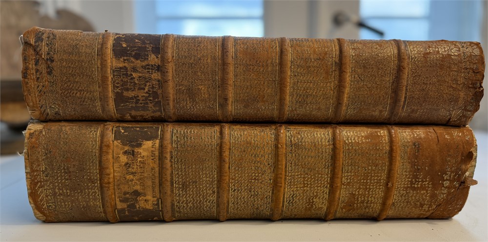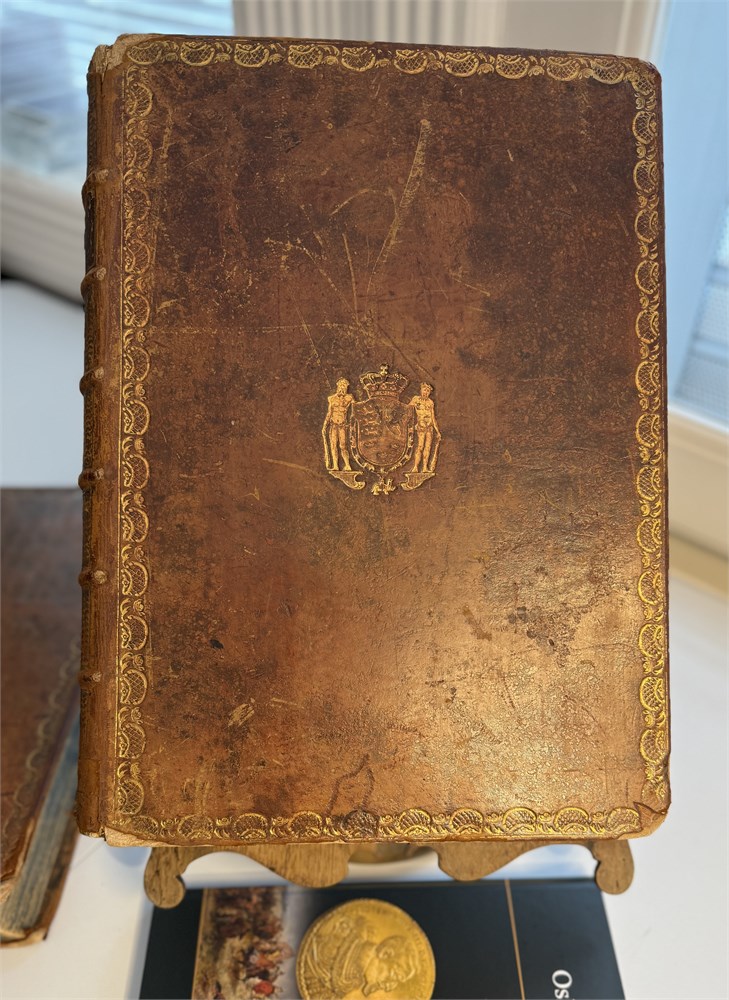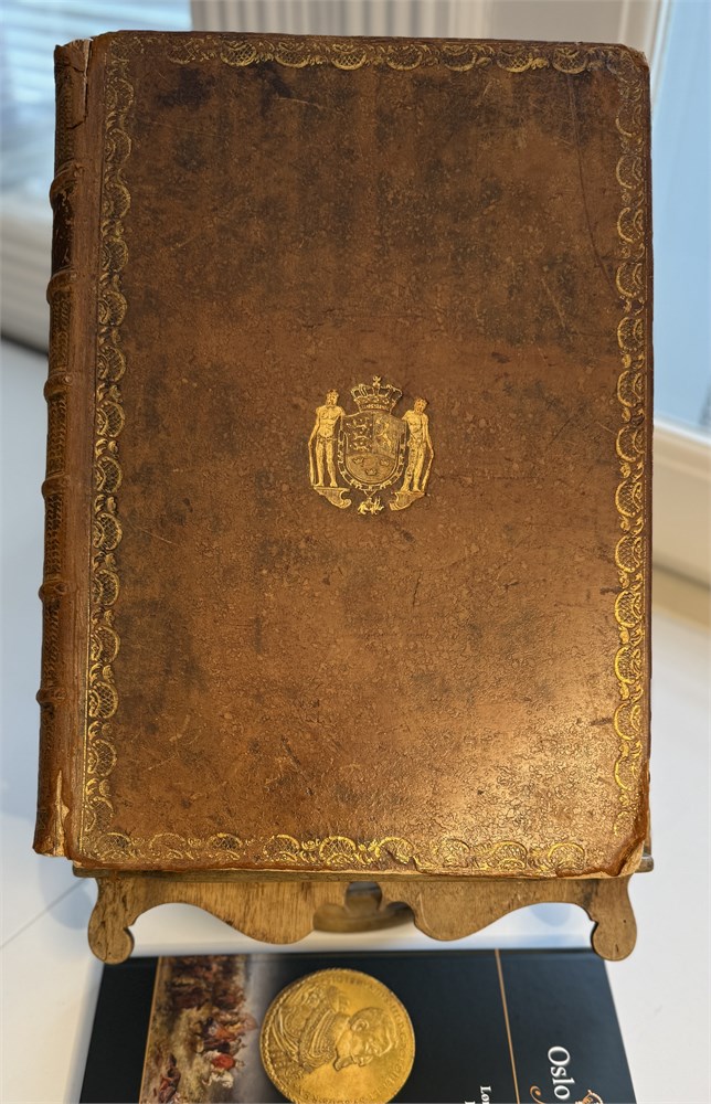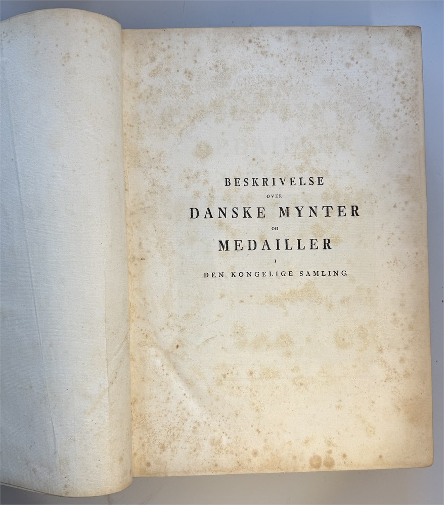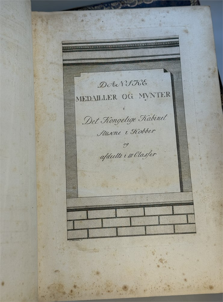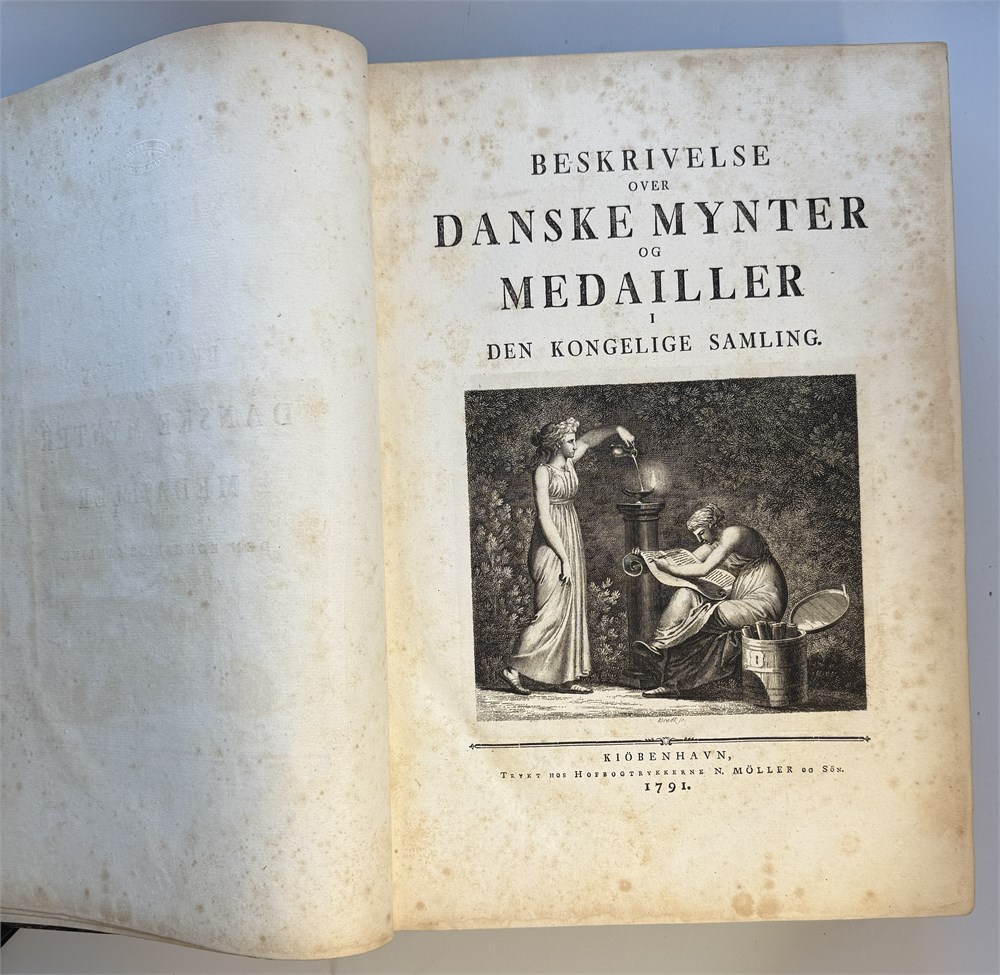 Beskrivelse over Danske Mynter og medailler i Den Kongelige samling 1791. Et bind med tekst og et med tavler i kobberstikk. Dedikert til KONGEN. Flott skinnperm med de to vildmenn, slitt rygg. ex Egil Bjørnholt, Tønsberg 1992 i en privat handel, ex DNF auksjon 5.12.1979, ex Ole Schelde, ex Ole Schelde senior 1900, ex J. Salomon antikvitetshandler i København 10. des 1896, ex Alfred Benzon 1888. Det tok ca 40 år å ferdigstille boken!