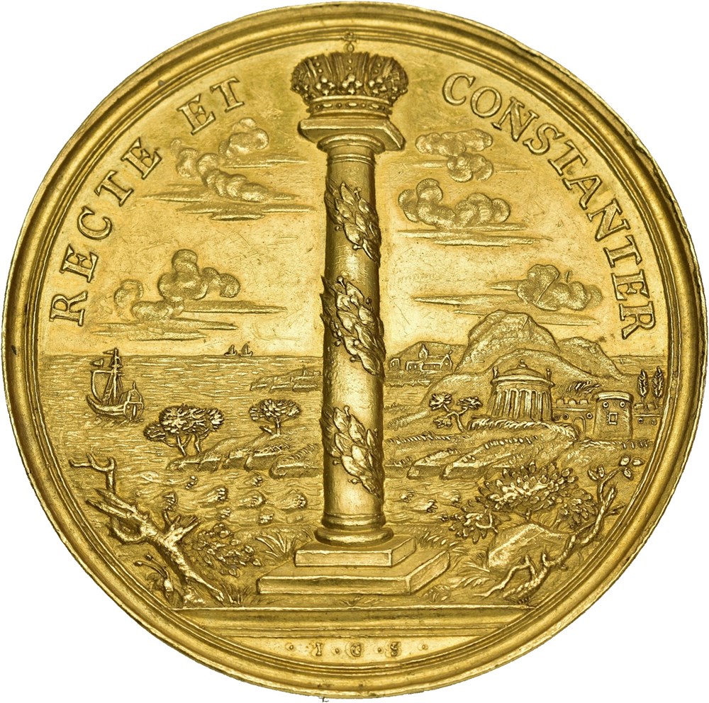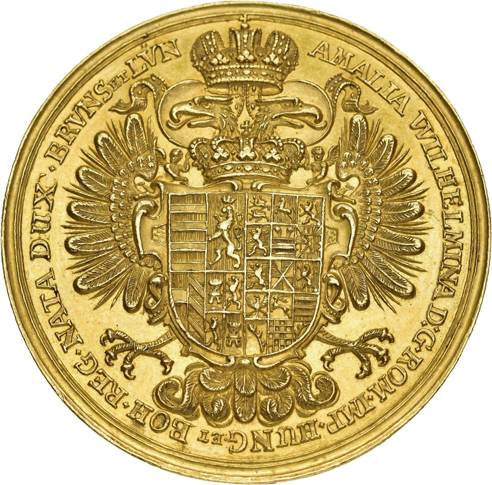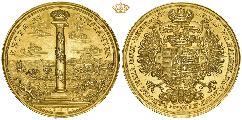 AMALIA WILHELMINA D G ROM IMP HUNG ET BOH REG NATA DUX BRVNS ET LVN Crowned double-headed eagle, on the chest the crowned combined coats of arms of Austria and Braunschweig. RECTE ET CONSTANTER Crowned, laurel-wreathed column on shore, temples and ships, in the exergue signature I G S.