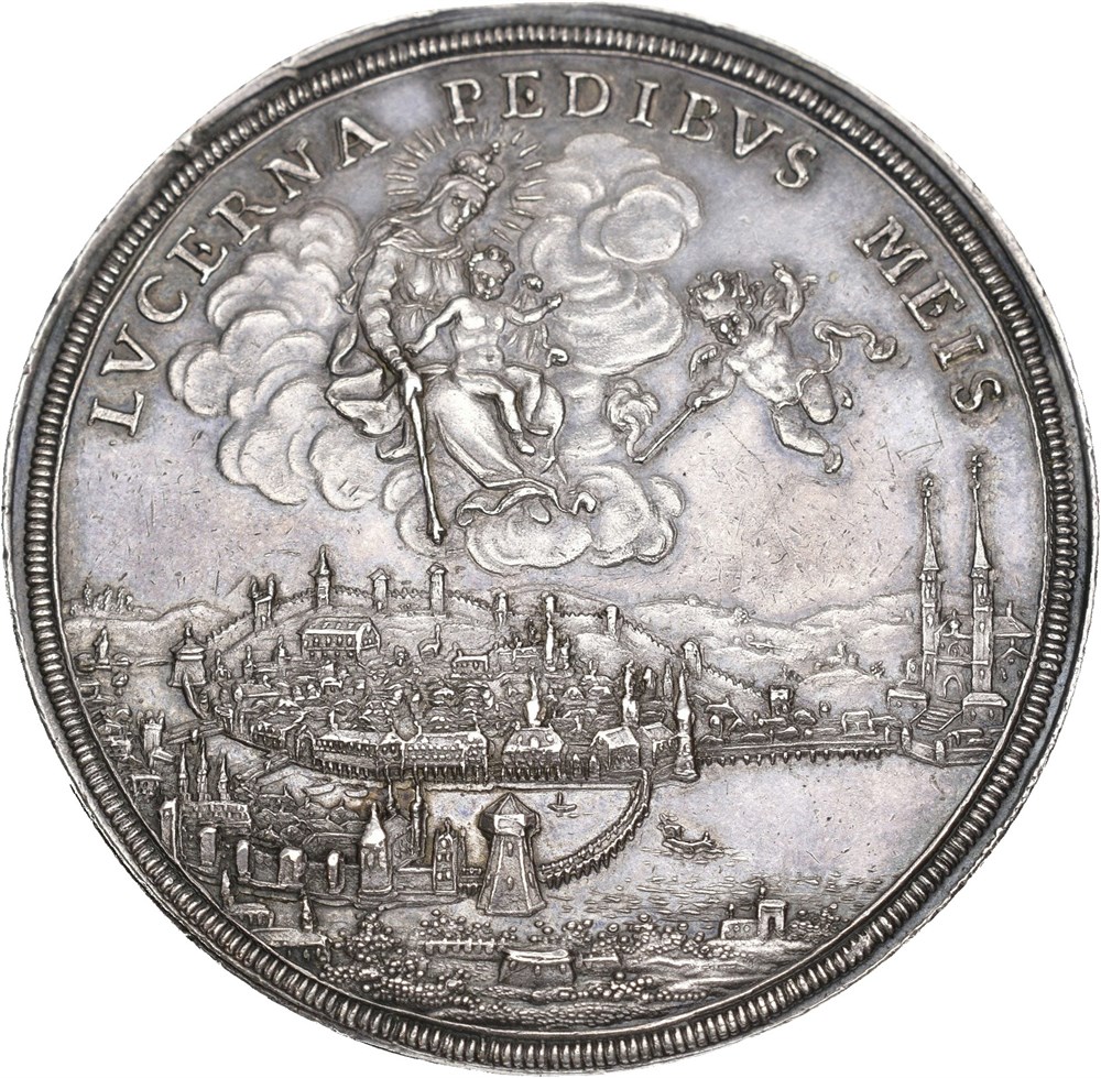 LVCERNA PEDIBVS MEIS, Madonna and Child on clouds pointing with a scepter at the city of Lucerne, right putto with torch.