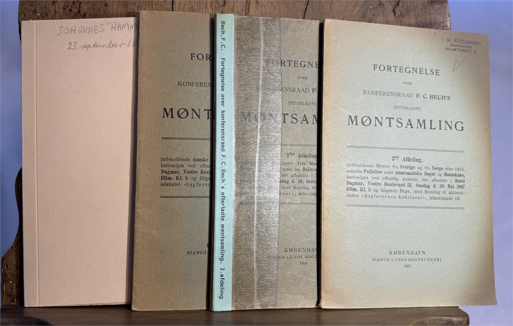 Fortegnelse over agent og grosserer Johannes Hammerich Mynt- og Medaille-samling 1855. ex Finn Rasmussen, dublett 23.7.1992, ex Morten Mortensen. Nytt kartongomslag. Fortegnelse over konferensraad F. Bech’s Møntsamling 1.avdeling, 2.avdeling, 3. avdeling. Kartong. bind 1 og 3 er pene, bind 2 slitt rygg.