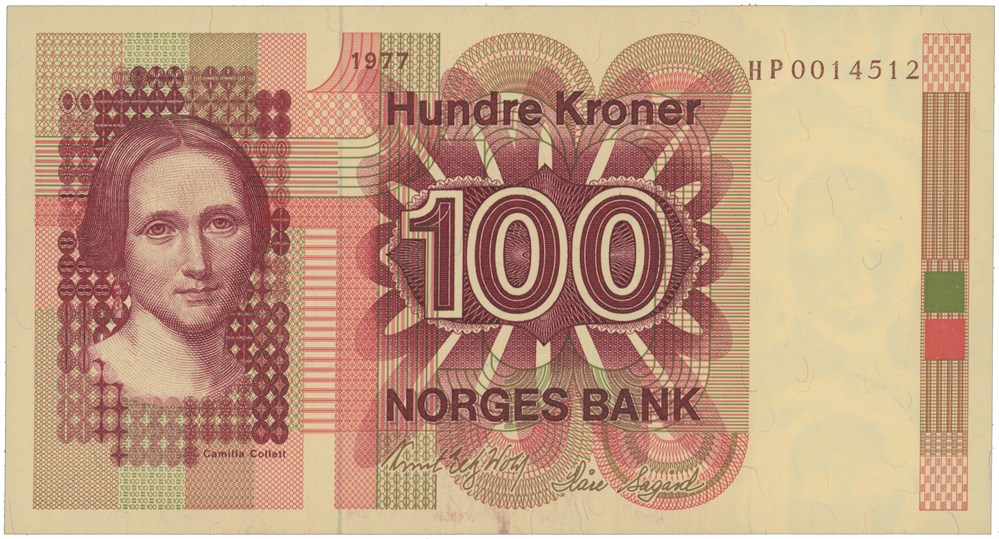 100 kroner 1977. HP0014512. Erstatningsseddel/replacement note.