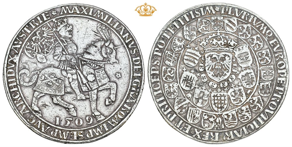 Maximilian I was in the Netherlands in 1517 and needed prestige coins (Schauguldiner) to use as gifts. He wanted to have dies sent from Hall, but the dies were owned by the engravers in Hall, and the Innsbruck government was concerned that coins with a lower silver content might be struck in Antwerp, which would have a negative impact on the reputation of the Mint in Hall. Finally, the government relented and sent a die for the Schauguldiner to the Netherlands. This die was marked with a rosette in front of the horse.